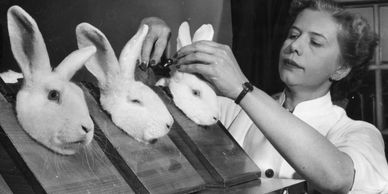 Photo from around 1950, a lab assistant puts rabbits into boxes designed to measure their body temperature every 15 minutes. Fox Photos/Getty Images